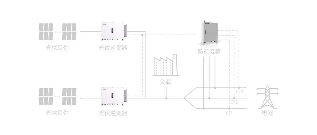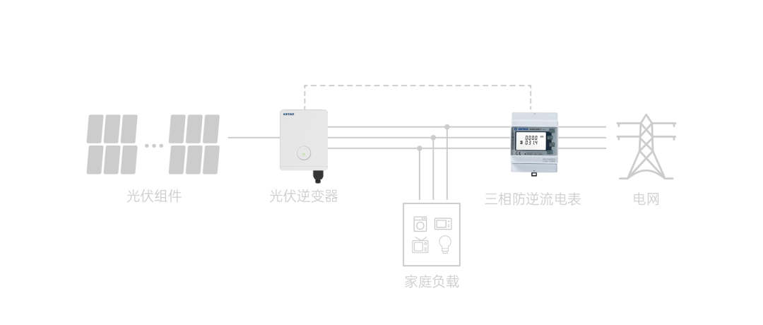 在光伏系統(tǒng)中,光伏組件輸出直流電通過逆變器,轉換為交流電供負載使用;當光伏系統(tǒng)的發(fā)電功率大于負載功率時,由于負載無法全部消納光伏發(fā)出的電,多余的電力就會反方向流入電網,產生“逆流”。而具備防逆流功能的光伏系統(tǒng),可以在發(fā)電功率大于負載功率時,及時降低逆變器輸出功率,以降低系統(tǒng)整體發(fā)電功率,確保光伏發(fā)出的電僅供負載使用,避免多余的電力流向電網。